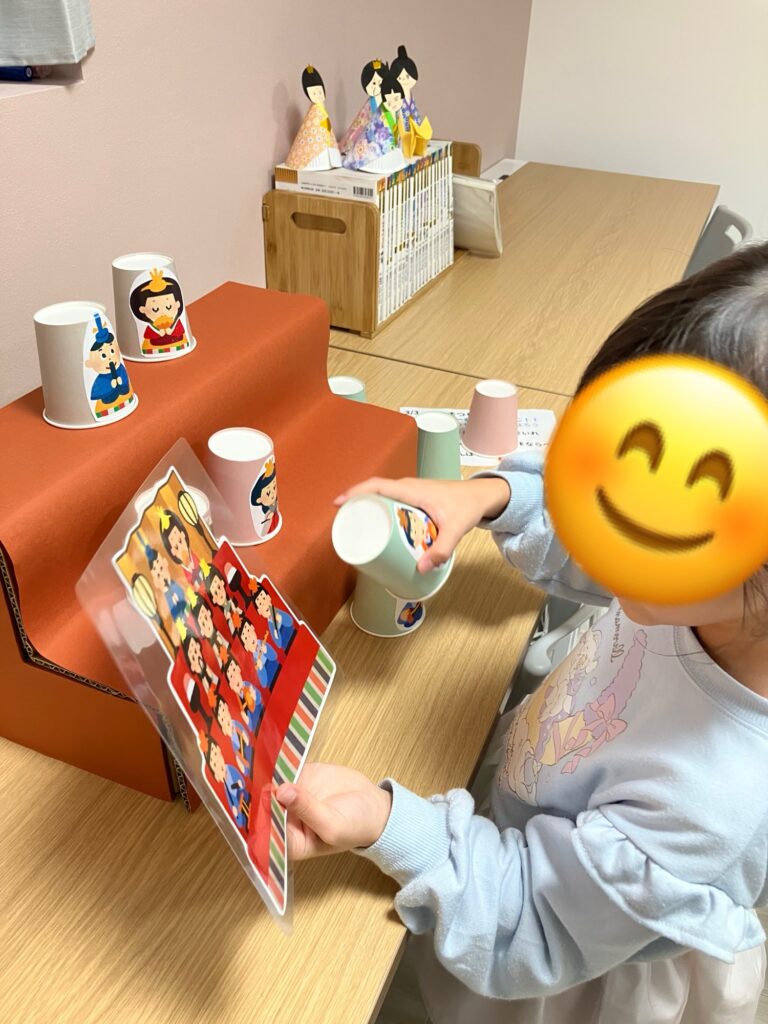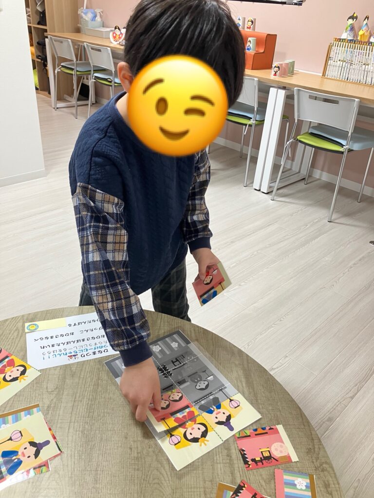 バラバラのピースを組み合わせて、お雛様を完成させます。指先に集中して、ピタッとはまった瞬間のスッキリした表情が印象的でした。