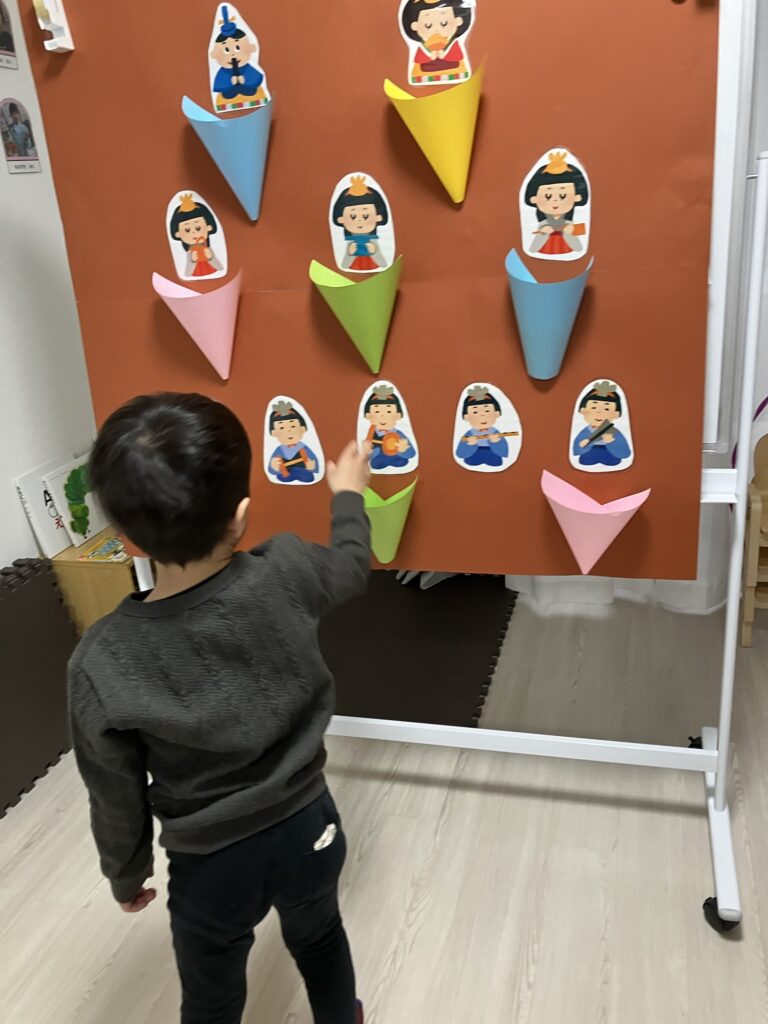 お手本のイラストをじっくり観察!「お内裏様は右かな?左かな?」と、視覚情報を整理しながら正しく並べていきます。
